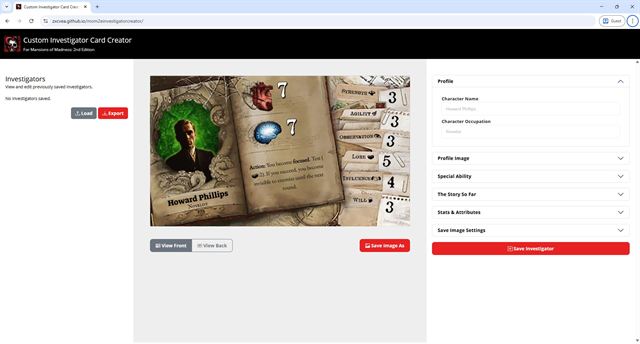This web app was originally designed to bring a new range of unique and more balanced custom Investigators to play with Mansions of Madness: 2nd Edition. When playing, select an existing Investigator in the official MoM:2e app and substitute the character with one from this web app or your very own custom one (see below for more details). This app is free to use and designed to be viewed on mobile.